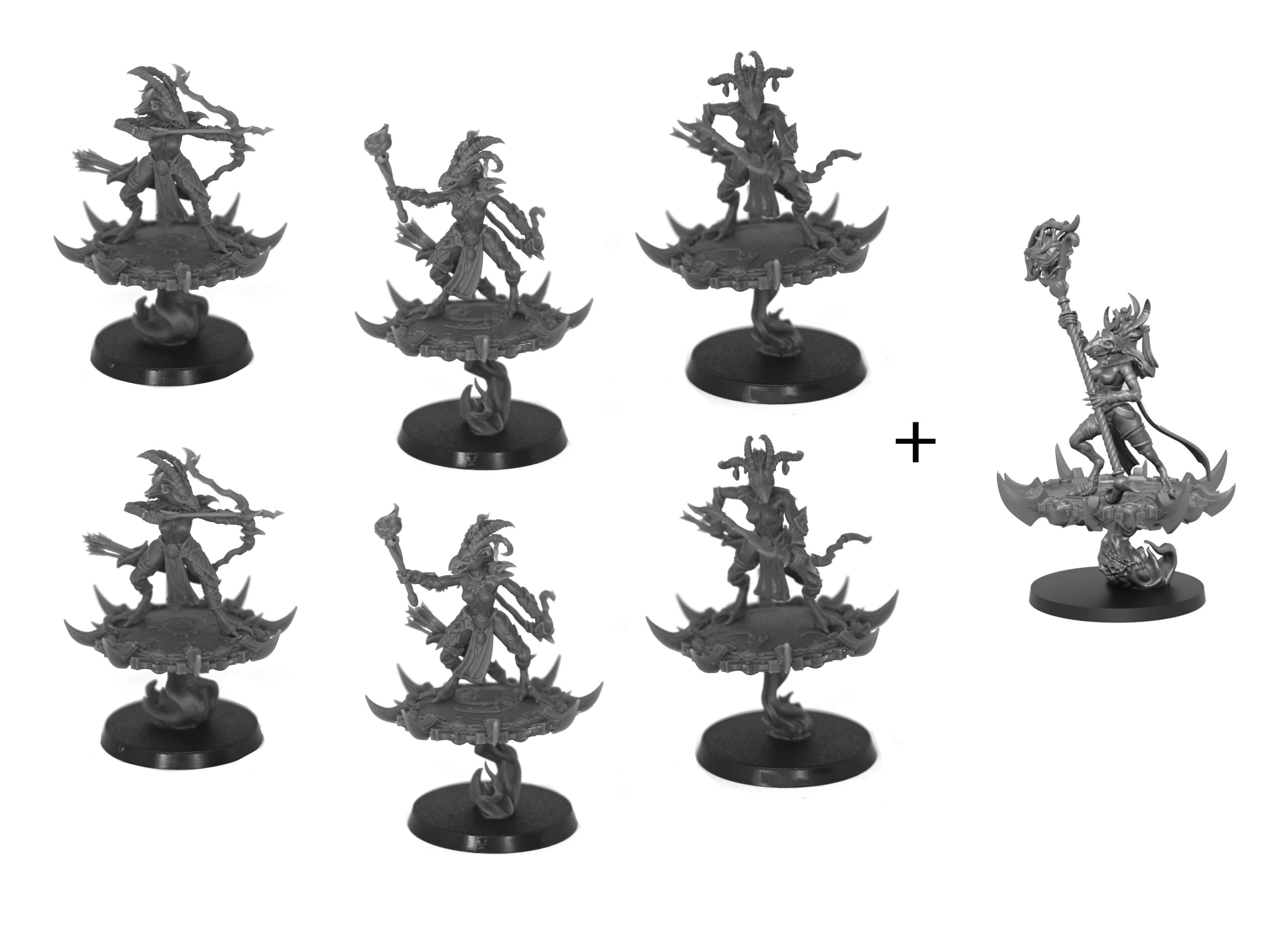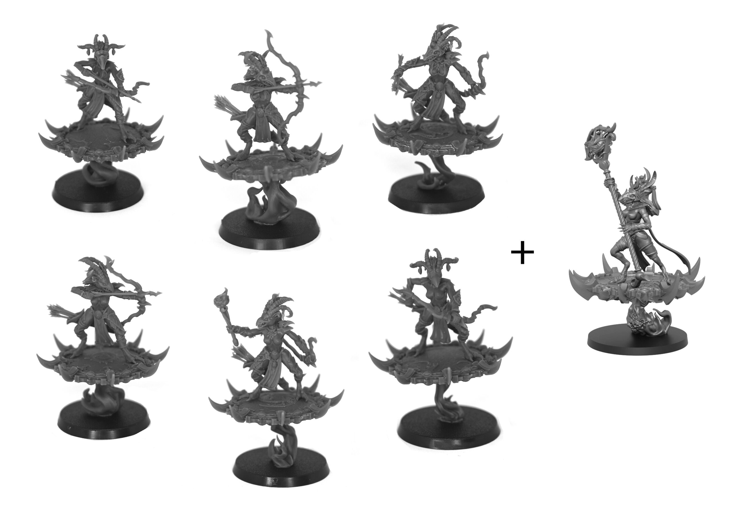 Group of 6 mythical bird-girls with bows, quivers and arrows on a flying disks + Shaman.